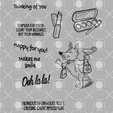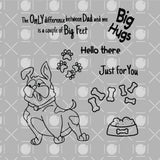 4"x 4" Digital Stamp Set. Big Hugs stamp set, features one adorable dog with paw prints and bone food that can be used alone or combined and four sentiments. The dog measure is 2.7/8" tall by 2.00" wide. The supporting images contain a paw prints set and bone food. The 4 different themed sentiments that can be used in coordination with the images or separately. Making a total of 7 stamps in the set. Make adorable friendship, birthday or snarky projects for any time of the year.
